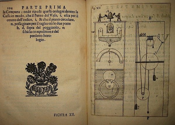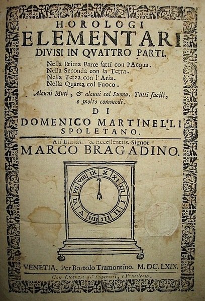 Horologi elementari divisi in quattro parti. Nella Prima Parte fatti con l’Acqua, nella Seconda con la Terra, nella Terza con l’Aria, nella Quarta col Fuoco.