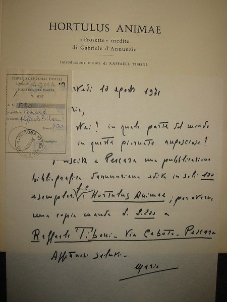 4to (cm, 31,7), (2)18(2) pp. Brossura editoriale. Edizione fuori commercio di 100 esemplari numerati (nostro n. 36). Si allega una lettera autografa di Mario Vecchioni che consiglia quest’opera ad un amico.