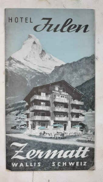 Pieghevole di 6 facciate di cm. 20 x 11; con illustraz. fotograf. in nero; copertina con illustraz. fotograf. a due colori (albergo in primo piano e Cervino sullo sfondo). VG. ** Testo in tedesco e inglese. Bello.