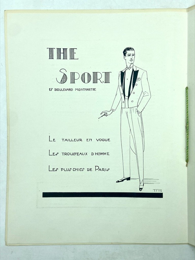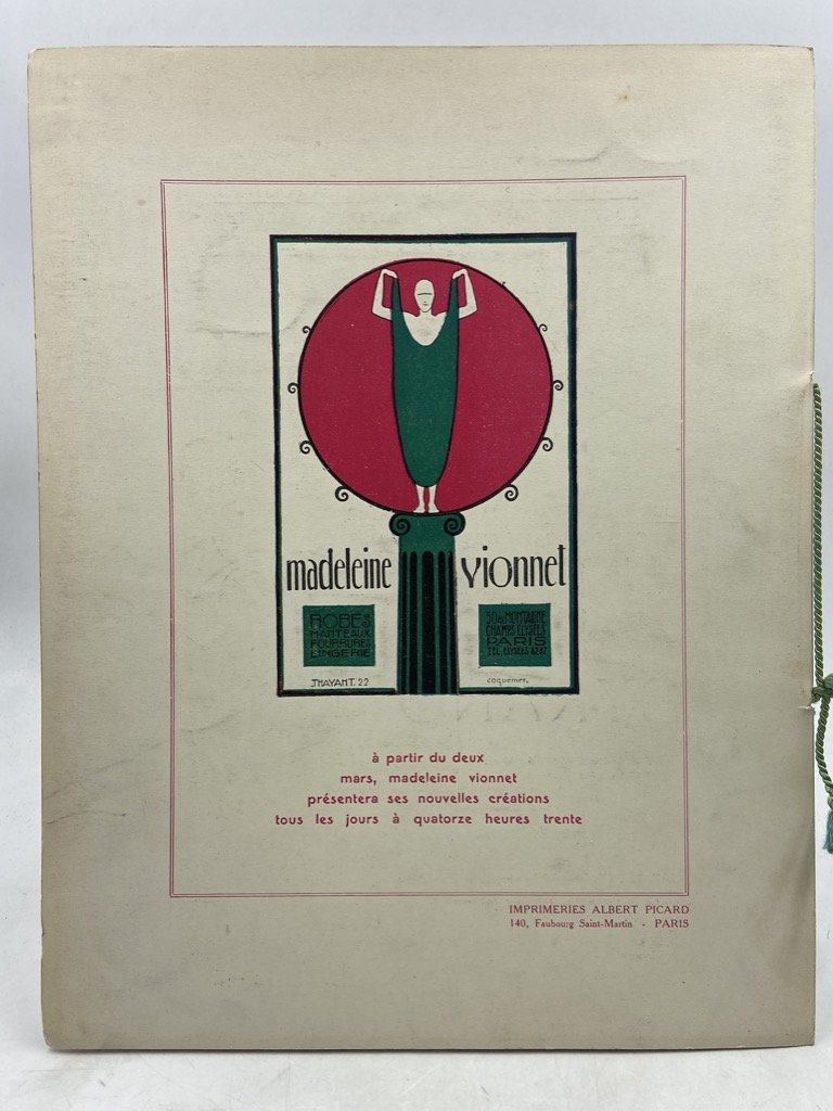 Opuscolo spillato con legatura in nastrino verde, brossura a colori cm 28 x 22, pp 8 illustrate in nero. Testo in francese e inglese. Molto ben conservato, minimi segni d'uso sulla brossura. Programma del ballo di beneficienza dell’11 febbraio 1925 all’Hotel Majestic di Nizza, intitolato DINER ET BAL DES ROIS e organizzato da Comité de Fêtes de France, Eclaireur de Nice e Petit Niçois a beneficio dei Laboratoires Françaises de Radiologie Gratuite; il ballo si articolava in 14 quadri in cui «gens du monde, des lettres et des arts, artistes en vedette, étoiles de cinema» apparivano in costumi ideati da artisti quali Maurice Neumont, Léo Fontan, Paul Ranson e altri. La copertina a colori è di Maurice Neumont (Paris 1868 - 1930), su frontespizio e ultima pagina figurano illustrazioni firmate rispettivamente «Rénic» e Jean Chaperon (Paris 1887 - Nice 1969); sono inoltre presenti annunci pubblicitari tra i quali segnaliamo l'elegante immagine di Ettore Tito (Castellammare di Stabia 1859 - Venezia 1941) per la sartoria The Sport di Montmartre e, a colori sul piatto posteriore, l'iconico logo della Maison Madeleine Vionnet disegnato nel 1922 da Thayat (Ernesto Michahelles, Firenze 1893 - Marina di Pietrasanta 1959). ENGLISH (automatic translation): Stapled booklet bound with green ribbon, color cover paperback, 28 x 22 cm, 8 pages illustrated in black. Text in French and English. Very well preserved, minimal signs of use on the paperback. Program of the charity ball of February 11, 1925 at the Hotel Majestic in Nice, entitled DINER ET BAL DES ROIS and organized by the Comité de Fêtes de France, Eclaireur de Nice and Petit Niçois to benefit the Laboratoires Françaises de Radiologie Gratuite; the ball was divided into 14 scenes in which «gens du monde, des lettres et des arts, artistes en vedette, étoiles de cinema» appeared in costumes designed by artists such as Maurice Neumont, Léo Fontan, Paul Ranson and others. The color cover is by Maurice Neumont (Paris 1868 - 1930), the title pege and last page feature illustrations signed respectively «Rénic» and Jean Chaperon (Paris 1887 - Nice 1969); there are also advertisements among which we point out the elegant image by Ettore Tito (Castellammare di Stabia 1859 - Venice 1941) for the tailoring shop The Sport in Montmartre and, in color on the back cover, the iconic logo of the Maison Madeleine Vionnet designed in 1922 by Thayat (Ernesto Michahelles, Florence 1893 - Marina di Pietrasanta 1959).