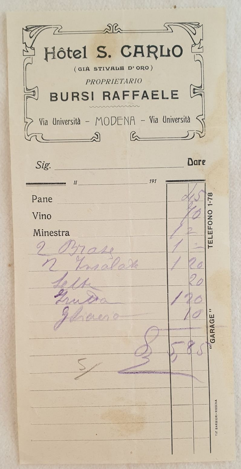 Bella fattura di inizio novecento dell'Hotel San Carlo via Università Modena. Lista delle pietanze consumate all'interno del ristorante dell'albergo. In buone condizioni, piegature. Dim. cm 20,5x10. Beautiful invoice of early 20th century of the Hotel San Carlo via Università Modena. List of food in the dinner in the restaurant of the hotel. In good conditions, foldings. Dim. cm 20,5x10