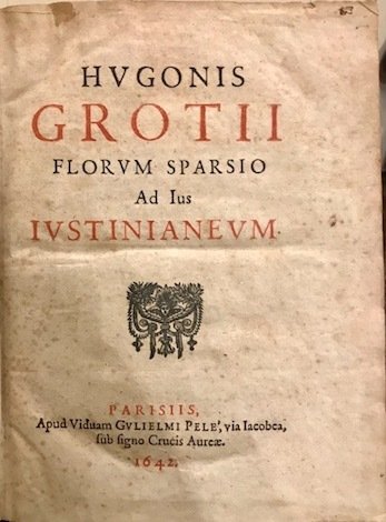 4to (cm. 23,7), 415(1) pp. Frontespizio stampato in rosso e nero con fregio xilografico. Legatura ‘700 in pergamena rigida con titolo oro su tassello dipinto al ds. Tagli rossi. Lieve uniforme brunitura della carta ed alcune sporadiche macchioline, altrimenti esemplare in ottimo stato di conservazione. Prima rarissima edizione di quest’opera poco conosciuta del celebre giurista e filosofo olandese. Cfr. Struvius, ‘Bibliotheca Iuris selecta’, p. 393.