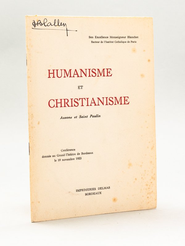 1 brochure in-8, Imprimerie Delmas, Bordeaux, 1954, 28 pp. Etat très satisfaisant (qq. rouss.) pour cette conférence de Mgr. Emile Blanchet (1886-1967), recteur de l'Institut Catholique de Paris, de 1946 à 1966.