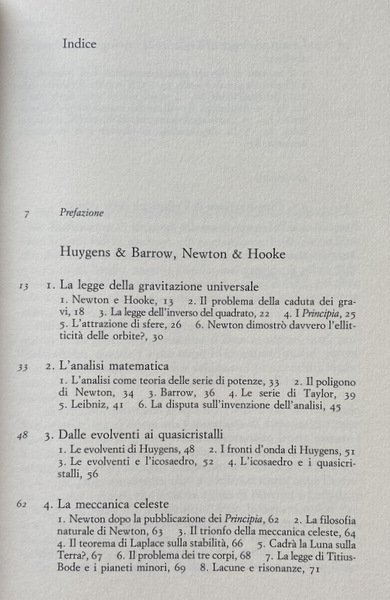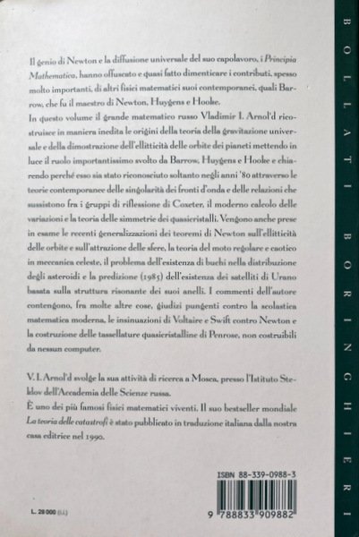 In questo volume il grande matematico russo Vladimir I. Arnol'd ricostruisce in maniera inedita le origini della teoria della gravitazione universale e della dimostrazione dell'ellitticità delle orbite dei pianeti mettendo in luce il ruolo importantissimo svolto da Barrow, Huygens e Hooke e chiarendo perché esso sia stato riconosciuto soltanto negli anni '80 attraverso le teorie contemporanee delle singolarità dei fronti d'onda e delle relazioni che sussistono fra i gruppi di riflessione di Coxeter, il moderno calcolo delle variazioni e la teoria delle simmetrie dei quasicristalli. Vengono anche prese in esame le recenti generalizzazioni dei teoremi di Newton sull'ellitticità delle orbite e sull'attrazione delle sfere, la teoria del moto regolare e caotico in meccanica celeste, il problema dell'esistenza dei buchi nella distribuzione degli asteroidi e la predizione (1985) dell'esistenza dei satelliti di Urano basata sulla struttura risonante dei suoi anelli. I commenti dell'autore contengono, fra molte cose, giudizi pungenti contro la scolastica matematica moderna, le insinuazioni di Voltaire e Swift contro Newton e la costruzione delle tassellature quasicristalline di Penrose, non costruibili da nessun computer.