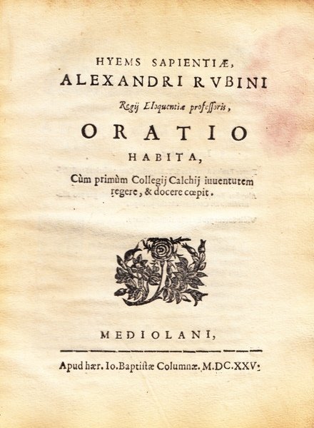 Hyems sapientiae Alexandri Rubini Regij Eloquentiae professoris Oratio Habita, Comi primum Colegij Calchij iuventutem regere, & docere coepit. Alessandro Rubini Rubino.