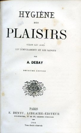 In-16°, pp. (4), 332, legatura del tempo t. tela rossa con titolo in oro al dorso e impressioni a secco ai piatti. Qualche fioritura. Bell'esemplare. Seconda edizione di questo trattato sui piaceri di ogni possibile ordine e grado: piaceri dell'infanzia, l'amore fisico, il matrimonio, piaceri solitari, aberrazioni erotiche, igiene sessuale, paternità e maternità, erotismo negli anziani, piaceri della vecchiaia, piaceri dell'udito, dell'olfatto, della vista, del gusto, del tatto, rapporti che intercorrono tra le parti della giornata e le stagioni, piaceri della primavera, dell'estate, dell'autunno e dell'inverno. Auguste Debay (1802-1890), ex medico militare, divenne famoso come divulgatore scientifico per una serie di testi di argomento medico, con particolare riferimento all'igiene matrimoniale'. La posizione di Debay sull'argomento, corrispondente alla visione secolare dominante in Francia all'epoca, suggeriva di seguire una equilibrata via di mezzo fra la stretta continenza e l'abbandono totale ai 'piaceri venerei'.