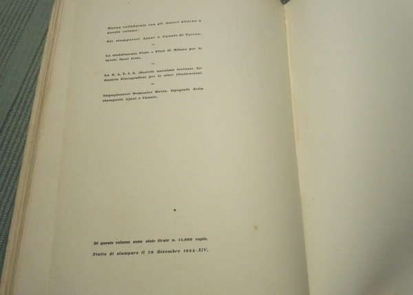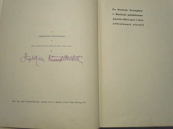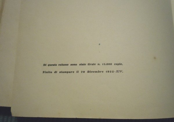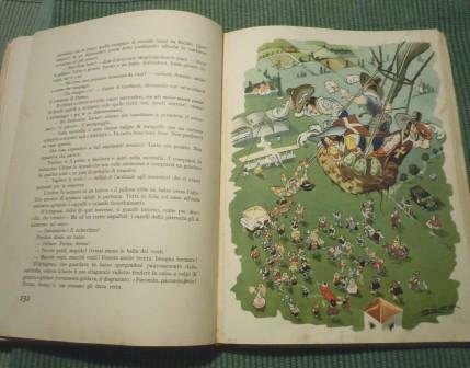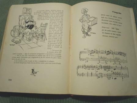 Ajani & Canale, Torino, 1935. Prima edizione. Cartonato illustrato, in 8°, pp. 240. Dorso in tela rossa restaurato professionalmente. Illustrazioni in policromia e bicromia. Le tavole fuori testo sono impresse nello Stabilimento Pizzi e Pizio di Milano. Prima tiratura di 15.000 copie, finita di stampare il 20 dicembre 1935. Buonissime condizioni.