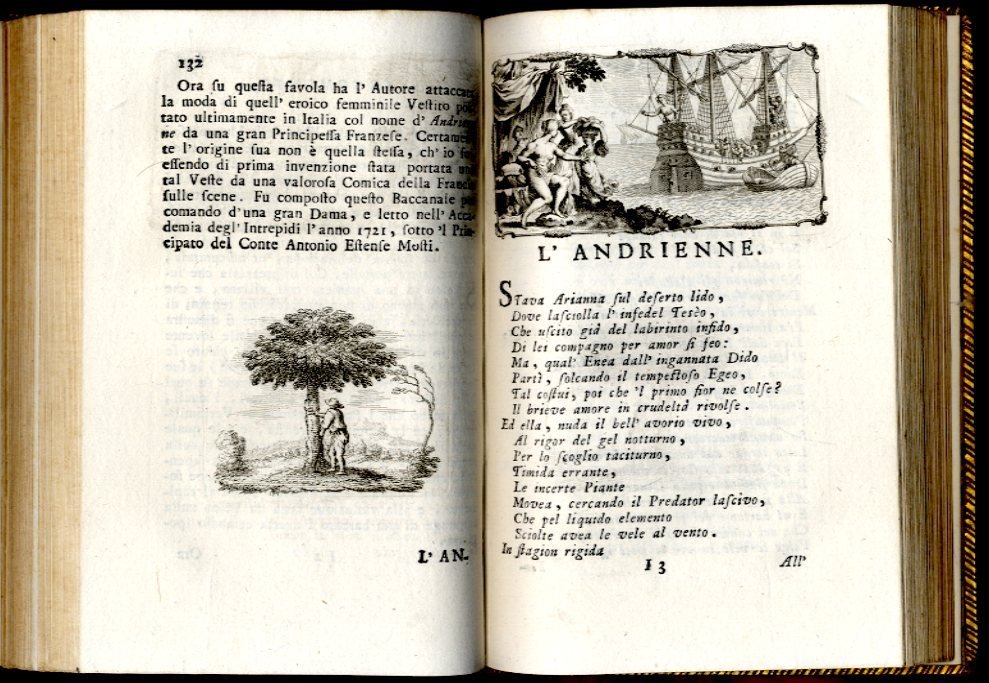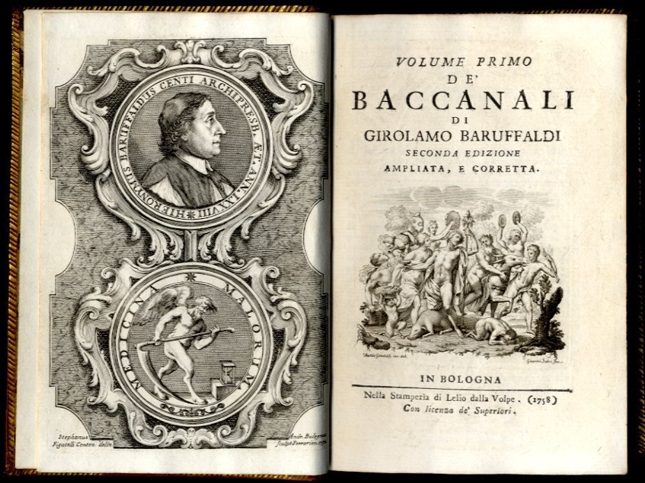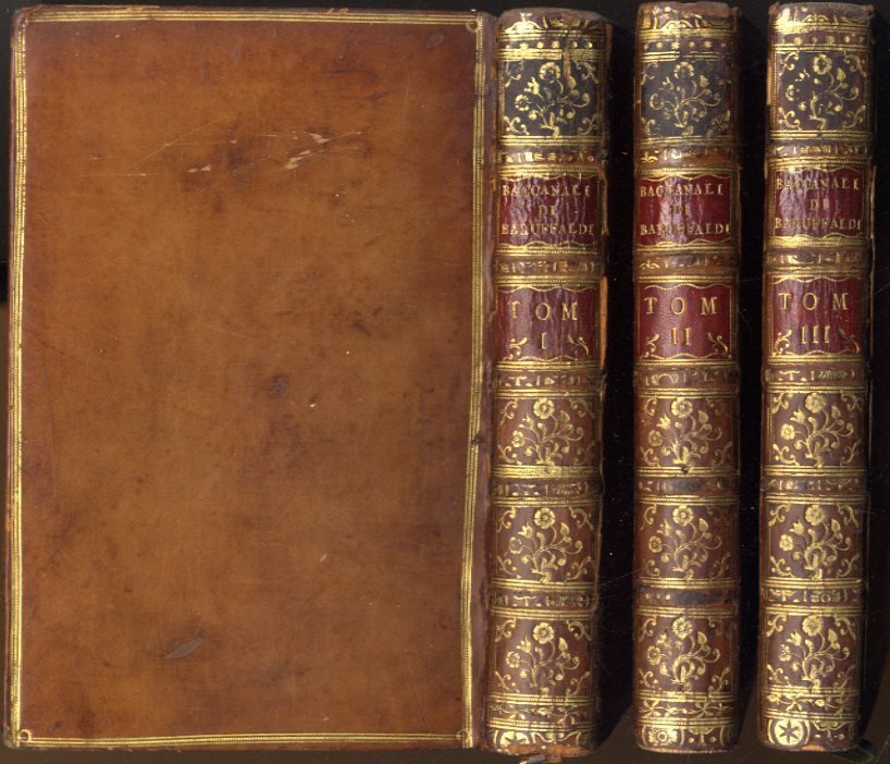 >3 volumi in-8 (177x115 mm), pp. XV, 272, (8), 291, (8), 289, bella legatura coeva in pelle pelle, dorsi a nervi con ricchi fregi e titoli oro, tagli dorati, dentelles. Antiporta inciso da A. Bulzoni con ritratto dell'autore in medaglione, deliziose illustrazioni: vignetta ai tre titoli, 37 graziosi finalini e 29 grandi testate figurate che illustrano l'argomento di ogni componimento. Elegantissima stupenda edizione bolognese della raccolta postuma dei ditirambi del Baruffaldi (Ferrara 1675-1755). Sono 27 composizioni poetiche di varia lunghezza che trattano mascherate, corse, cacce, feste, giochi, banchetti e cibi tipici regionali, tutti argomenti di grande interese per la storia del costume del tempo, ciascuno introdotta dalla descrizione in prosa dell'intrattenimento in voga. Il terzo volume è interamente riservato, coll'aggiunta di copiose note, alla ''Tabaccheide'', la sua composizione più nota, composta in onore del tabacco, ''la droga dei poeti, l'elisir dei letterati'', che comporta un interessante elenco dei contemporanei illustri che ne facevano uso. Esemplare assai bello, raro (ex-libris Wilmot Viscount Lisburne). Gamba n. 2143.