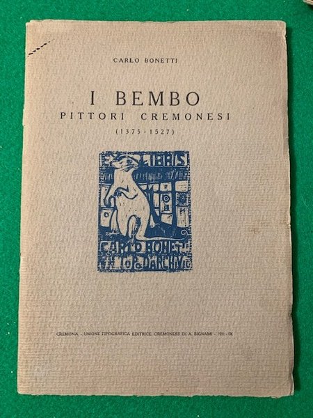 In 4°; (2), 30, (4) pp. e una c. di tav. Brossura editoriale illustrata animata in azzurro al piatto anteriore. Dedica autografa dell'autore alla prima carta bianca. Monografia dedicata alla storia dei pittori cremonesi Bembo che operarono tra il quattro e cinquecento. Esemplare in buone-ottime condizioni di conservazione.