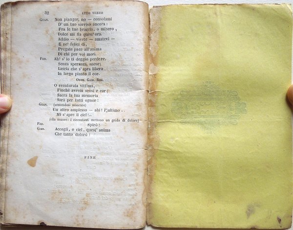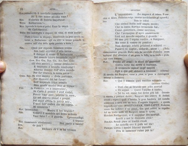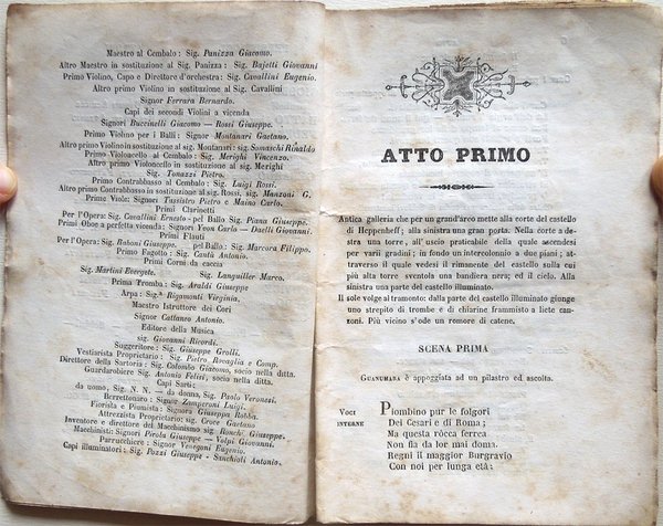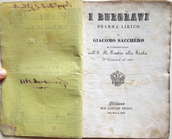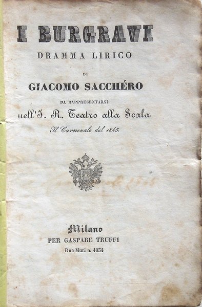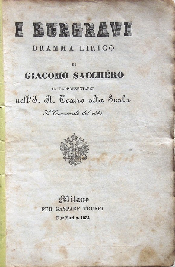 In-16° (17,2 x 11,2 cm), pp. 32, copertina editoriale con titoli, alla prima di copertina, entro cornice. Qualche segno d'uso e del tempo alla copertina, in particolare: alla copertina anteriore, due mancanze, una, nella parte centrale, che non interessa i titoli, e una nell'angolo inferiore esterno, ben risarcite mediante applicazione di carta giapponese alla seconda di copertina; alla prima e alla quarta di copertina, all'altezza dell'angolo inferiore esterno, macchie d'inchiostro; alla prima di copertina, firma d'appartenenza e scritta «Carnevale 1845» vergate, a inchiostro, da stessa mano coeva. La scritta alla prima di copertina si è impressa, leggermente, al frontespizio. Alle pagine, segni d'umido e, in alcune, qualche piccolissima macchia d'inchiostro al margine inferiore e nella parte inferiore del margine esterno. Per il resto, ben conservato. Libretto della prima rappresentazione, andata in scena l'8 marzo 1845. Personaggi ed interpreti: Giobbe, burgravio di Heppenheff, Achille De Bassini; Hatto, burgravio di Nollig, Antonio Benciolini; Federico di Svevia, Antonio Selva; Oberto, avventuriere italiano, Luigi Ferretti; Gerardo, duca di Turingia, Francesco Lodetti; Gilissa, margravio di Lusazia, Napoleone Marconi; Dario, burgravio di Lahnech, G. B. De Gattis; La contessa Regina, nipote di Giobbe, Fortunata Tedesco; Guanumara, Rita Gabussi; Edvige, Teresa Ruggeri; Aldo, paggio, Felicita Bayllou; Un soldato. Schiavi, Principi e Burgravi, Paggi, Soldati, Musici, Araldi, Sgherri. Da pagina 3: «Heppenheff, XII. Musica del maestro signor Matteo Salvi. Questi burgravi vennero tratti dalla nota trilogia di Hugo. Le scene d'architettura sono inventate e dipinte dai signori Merlo Alessandro e Fontana Giovanni; quelle di paesaggio dal sig. Boccaccio Giuseppe». Musicisti: Maestro al cembalo: Giacomo Panizza; Altro maestro, in sostituzione del sig. Panizza: sig. Giovanni Bajetti; Primo Violino, Capo e Direttore d'Orchestra: Eugenio Cavallini; Altro primo Violino, in sostituzione del sig. Cavallini: Bernardo Ferrara; Capi dei secondi Violini a vicenda: Giacomo Buccinelli, Giuseppe Rossi; Primo Violino per i Balli: Gaetano Montanari; Altro primo Violino, in sostituzione al sig. Montanari: Rinaldo Somaschi; Primo Violoncello al Cembalo: Vincenzo Merighi; Altro primo Violoncello in sostituzione al sig. Merighi: Pietro Tonazzi; Primo Contrabbasso al Cembalo: Luigi Rossi; Altro Primo Contrabbasso in sostituzione al sig. Rossi: G. Manzoni; Prime Viole: Pietro Tassistro, Carlo Maino; Primi Clarinetti per l'opera: Ernesto Cavallini; pel Ballo: Giuseppe Piana; Primi Oboe a perfetta vicenda: Carlo Yvon, Giovanni Daelli; Primi Flauti: per l'opera, Giuseppe Raboni, pel ballo, Filippo Marcora; Primo Fagotto: Antonio Cantù; Primi Corni da Caccia: Evergete Martini, Marco Languiller; Prima Tromba: Giuseppe Araldi; Arpa: Virginia Rigamonti. Maestro istruttore dei cori: Antonio Cattaneo; Editore della musica: Giovanni Ricordi; Suggeritore: Giuseppe Grolli; Vestiarista Proprietario: Pietro Rovaglia e Comp.; Direttore della sartoria: Giacomo Colombo, socio nella ditta; Guardarobiere: Antonio Felisi, socio nella ditta; Capi sarti: da uomo, N. N. - da donna Paolo Veronesi; Berrettonaro: Luigi Zamperoni; Fiorista e piumista: Giuseppa Robba; Attrezzista proprietario: Gaetano Croce; Inventore e direttore del macchinismo: Giuseppe Ronchi; Macchinisti: Giuseppe Pirola, Giovanni Volpi; Parrucchiere: Eugenio Venegoni; Capi illuminatori: Giuseppe Pozzi, Antonio Sanchioli.