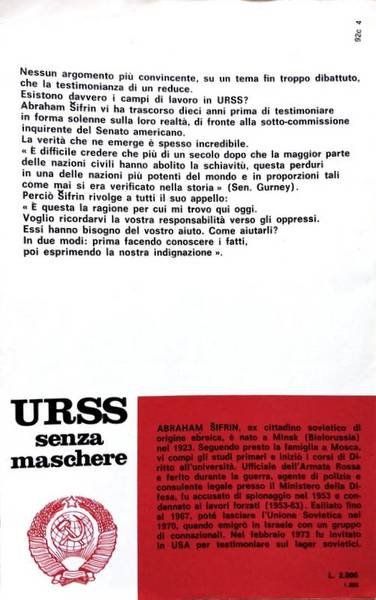 Soggetti: Storia Contemporanea, Europa Orientale, Russia, Campi di concentramento, Campi di lavoro, URSS, Unione sovietica, Gulag, Comunismo, Prigionia, Biografie, Storie vere, Testimonianze, Reclusione, Totalitarismo, Schiavitù, Anni Settanta, Les Camps de Travail en U.R.S.S., Deposizioni giudiziarie, Processi, Politica, Documenti storici, Lager, Breznev, Aleksandr Solzenicyn, Anatolij Marcenko, Dissidenti, Russi, Ucraini, Ebrei, Baltici, Tartari, Georgiani, Nemici del popolo, Oppositori politici, Cristiani ortodossi, Repressione, Perseguitati, Sopravvivenza, Lotta, Confessioni, KGB, Servizi segreti, Polizia, Mosca, Seconda Guerra Mondiale, Punizioni corporali, Tortura, Lavori forzati, Siberia, Intellettuali, Artisti, Andrej Sacharov, Diritti umani, Reduci, Sopravvissuti, Pena, Fonti, Corte marziale, Beria, Deportazioni, Lefortovo, Tajset, Omsk, Celle, Libri Vintage, Fuori catalogo, Corrective labor camps, Alimentazione, Cibo, Food rations, Counterrevolutionary crimes, Cultural and Educational, Crimini contro l'umanità, Privileged regime, Surrendered for safekeeping, Leningrad, Letters, Jews, Khrushchev, Israel, Jewish, Anti-Soviet, Army, Oblast, Special settler, Stakhanovite, Komsomol, Socialism, Punishment, Punitive policy, Le témoinage d'Abraham Chifrine devant le Sous-comité d'enquête du Conseil de la Magistrature de Sénat des Etats-Unis (1-2 février 1973), J'étais un espion, Staline, Lituanie, Loubyanka, Orcha, Moscou, Norilsk, Khrouchtchev, Krusciov, Kazakhstan, Juifs, Juive, Communistes, Condamnés, Ans de prison, Anti-soviétique, Arrestations, Piotr Yakir, Potma, Prisonniers politiques, Propagande, Régime, Déportés, Détenus, Directorat, Dissidents, Grandi purghe, Estonia, Crimini di massa nei regimi comunisti, Sharashka, Articolo 58 del Codice penale della RSFSR, Sterminio, Cortina di ferro, Contemporary history, Eastern Europe, Russia, Concentration camps, Work camps, USSR, Soviet Union, Communism, Captivity, Biographies, True stories, Testimonies, Imprisonment, Totalitarianism, Slavery, Seventies, Judicial depositions, Processes, Politics, Historical documents, Dissidents, Russians, Ukrainians, Jews, Baltics, Tartars, Georgians, People's Enemies, Political opponents, Orthodox Christians, Repression, Persecuted, Survival, Fight, Confessions, Secret services, Police, Moscow, World War II, Corporal punishment, Torture , Forced labor, Siberia, Intellectuals, Artists, Human rights, Veterans, Survivors, Penalty, Sources, Martial court, Berija, Deportations, Cells, Books Out of print, Food, Crimes against humanity, Great purges, Crimes mass in communist regimes, Article 58 of the Criminal Code, Extermination, Iron curtain