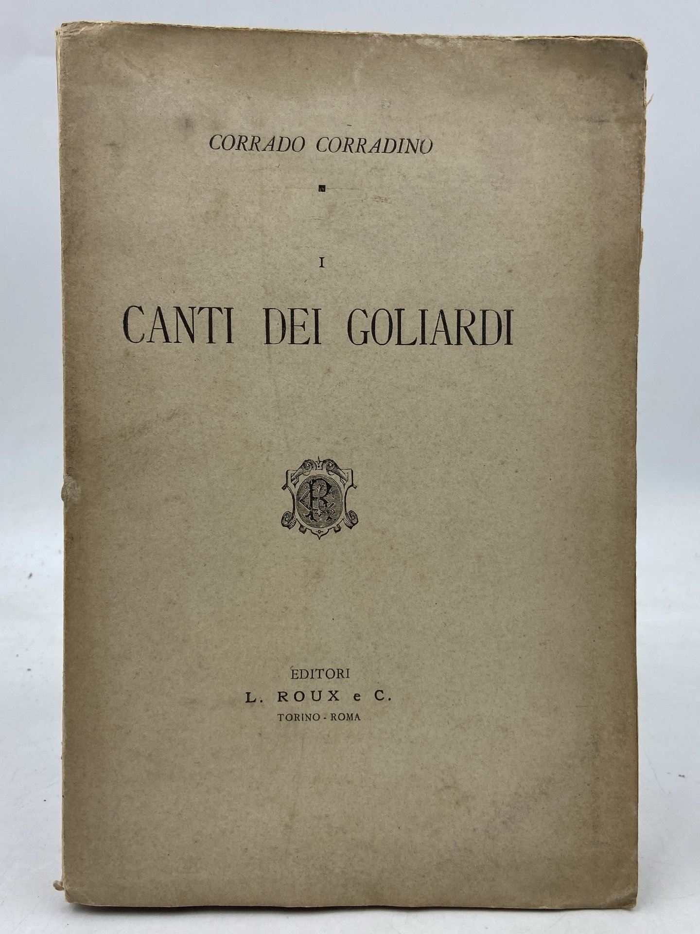 Brossura editoriale, cm 19x13, pp XLIV (2) 207 (5). Prima edizione di questa raccolta di canti studenteschi e carnascialeschi medievali, tratti principalmente dai Carmina Burana e tradotti dal letterato piemontese Corrado Corradino. L’opera è dedicata ad Arturo Graf, maestro dell’autore e insigne studioso del folclore. Preceduti da un’introduzione storica, i canti sono suddivisi in Satirici, Amorosi, Giocosi e bacchici. Corradino, critico letterario e poeta torinese, fu autore di numerose fortunate opere di divulgazione tra le quali un manuale di scrittura che conobbe 15 edizioni; nel 1915 compose l'Inno della Juventus e fu tra i fondatori della rivista dedicata alla squadra, Hurrà Juventus.