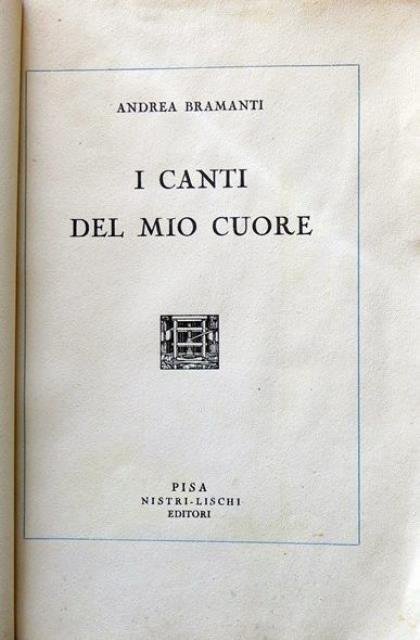Nistri – Lischi Editori, Pisa, 1933 - XI. In 8vo, 1 c. b. con dedica manoscritta alla prima bianca dell’Autore (“A Corrado Simoncini e gentile consorte l’autore, Vada 1938”), front., pp. (2) la pagina con la fotografia del Bramanti, e la pagina con foglio dattiloscritto del Segretario Federale al Preg. Sig. Dott. Andrea Bramanti di Vada (“Egregio Dottore, ho letto le sue liriche e con Lei mi compiaccio per la loro spontaneità e naturalezza. I suoi versi non hanno bisogno di viatico, ma solo di un fervido augurio. Saluti cordiali Avv. C. A. Cempini Meazzuoli”), pp. 3 - 146 (la pagina 3 reca la dedica dell’Autore (“Al Duce che ha dato il Fascismo al Mondo e la Santa Disciplina agli italiani, questo mio Primo Cantico offro con fedeltà”), testo quadrato da lieve filetto azzurro e intercalato da lacune immagini del luogo o di personaggi cui il componimento è dedicato, le poesie sono accompagnate da lunghi brani didascalici in merito al contesto storico e all’ambiente cui sono nate, bross. edit. in carta. Raro insieme di ispirazione fascista. L’autore era originario della località livornese di Vada. Esemplare con difetti alla brossura come il dorso ricostruito e alcuni aloncini di sporco e umido, ben conservato e in gran parte ancora intonso tutto l’interno.