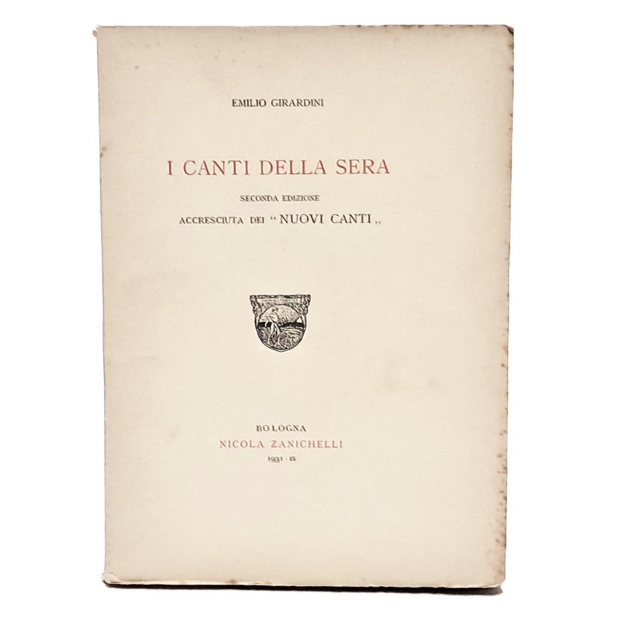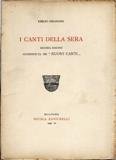 Seconda edizione accresciuta dei Nuovi canti. Colto autodidatta, fece l'assicuratore ma ebbe una passione intensa per la poesia. Fu traduttore di poeti e saggista e dal 1903 cominciò a pubblicare versi suoi, compresi in diverse raccolte. I canti della sera (1928, edizione accresciuta nel 1931), colpiti, nel 1952, da tagli e ritocchi, scompaginati nella sequenza, si legano in “canzoniere”: vi affluiscono temi e modi (anche metrici) diversi, l’ombra metaforica della sera, la casa dissolta, l’infanzia che restituisce fotogrammi e frammenti di vita, i fenomeni atmosferici. Gesti dimessi, filtrati dalla memoria privata e letteraria: se la «tacita luna» suppone Leopardi, il titolo del testo, Il carrettiere, devia su Pascoli, e a Pascoli rimandano Servetta, Voce misteriosa, Torpore. La lingua accoglie giunture tornite («ederacea torre», «muro ederoso», «nubila notte»), pur se il mondo esteriore, concreto, si sgretola, assumendo «non so che parvenza evanescente ed irreale» (Ermacora). Con la similitudine peraltro a istituire isole di certezza, a imbrigliare la frana: «Vanno i pensieri miei verso la morte: / branco d’agnelli che ritorna pingue / sul vespero a l’ovile e fra le porte / del borgatello suo la sua distingue» (Pace). E, quando lo sconforto sembra travolgere, ultima barriera è la maglia letteraria: «Sentendomi così fuggir la vita / io mi spauro, però che non voglio / ne la quiete perdermi infinita» (Sempre più soli), con intarsio vistoso di leopardismi. In brossura. Pp. 194. Volume intonso.