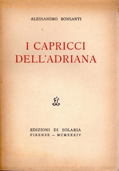 I capricci dell'Adriana, prima edizione dicembre 1934, pp. 359, formato 14 x 20.<BR>Copertina morbida color cachi con titoli in nero e rosso al piatto anteriore e sul dorso. Tiratura riservata alla vendita.Volume intonso.<BR>Lievi bruniture al piatto anteriore e sul dorso. Nel complesso ottime condizioni.<BR><BR>Alessandro Bonsanti scrittore italiano (1904 - 1984) già condirettore di Solaria, è stato successivamente direttore di Letteratura e del Gabinetto scientifico-letterario G. P. Vieusseux. Nel 1983 era stato eletto sindaco di Firenze. La sua narrativa, in cui suggestioni proustiane si coniugano con motivi di ascendenza manzoniana, tende a soluzioni liricheggianti e a un sommesso estetismo. Tra le sue opere: La serva amorosa, 1929 I capricci dell'Adriana, 1934 Racconto militare, 1937 La vipera e il toro, 1955 La buca di San Colombano La nuova stazione di Firenze, 1965 Portolani d'agosto, 1978.