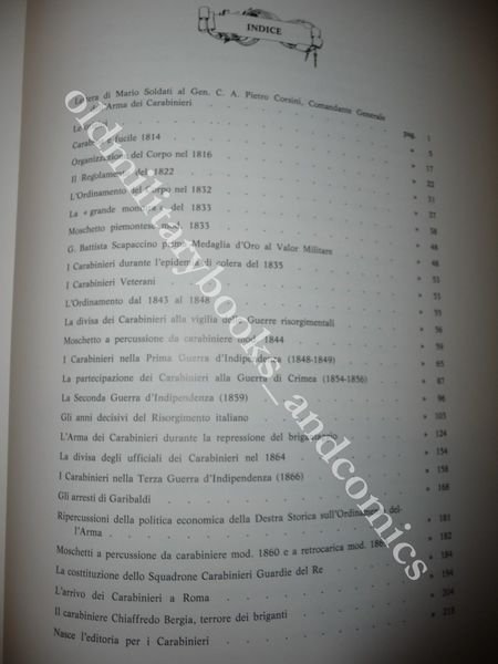 DESCRIZIONE: Pomezia Staderini 1980 br. ed. similpelle con sovracc. ill. Realizzato dall'Ente Editoriale per l'Arma dei Carabinieri diretto dal Gen. B. Mario De Sena. In particolare hanno collaborato il Ten. Col. Oscar Scaffidi e il Cap. Vincenzo Pezzolet dell'Ufficio Storico del Comando Generale dell'Arma dei Carabinieri. Stemma a colori su antiporta. Con numerose ill. in b/n e a col. pp. 617 in 4°. Mastodontica opera che narra la storia di questa meravigliosa Arma con gli eroi, le azioni più coraggiose e le grandi vette raggiunte. La storia dell'Arma dall'istituzione dell'antico Corpo dei Carabinieri Reali il 13 luglio 1814 al 1980, con le descrizioni dettagliate delle glorie acquisite sui campi di battaglia e nella lotta al brigantaggio e delle benemerenze civili nel soccorso alle popolazioni colpite da pubbliche calamità. CONDIZIONI: Ottime, tracce di fox. PESO / WEIGHT: 4117 gr. without package