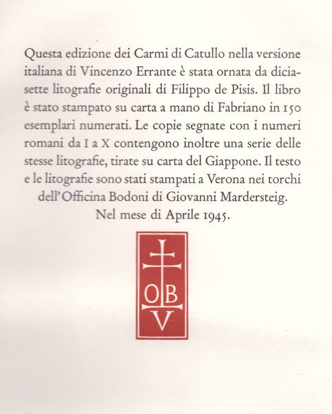 I CARMI DI CATULLO - SCELTI E NUOVAMENTE TRADOTTI IN VERSI DA VINCENZO ERRANTE E DECORATI CON LITOGRAFIE DA FILIPPO DE PISIS
