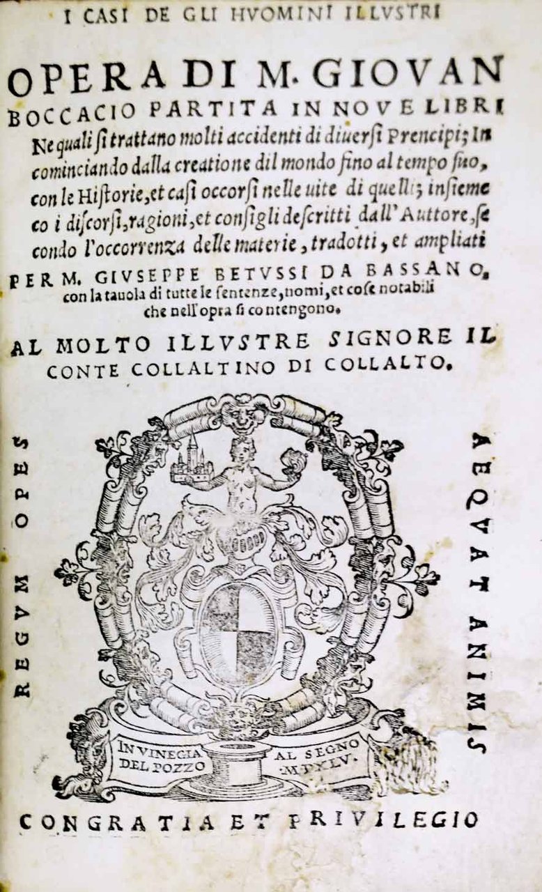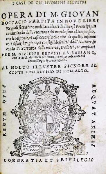 I CASI DE GLI HUOMINI ILLUSTRI. - Opera di M. Giovan Boccacio partita in Nove Libri.... Tradotti, et ampliati per M. Giuseppe Betussi da Bassano, con la tavola di tutte le sentenze, nomi, et cose notabili che nell'opra si contengono. Al molto illustre Signore il Conte Collaltino di Collalto.