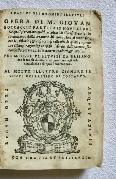 I casi de gli huomini illustri opera di M. Giovan Boccaccio partita in nove libri ne quali si trattano molti accidenti di diversi Prencipi; Incominciando dalla creatione dil mondo fino al tempo suo, con le Historie, et casi occorsi nelle vite di quelli; insieme co i discorsi, ragioni et consigli descritti dall'Auttore secondo l'occorrenza delle materie, tradotti, et ampliati per M. Giuseppe Betussi da Bassano con la tavola di tutte le sentenze, nomi, et cose notabili che nell'opra si contengono.
