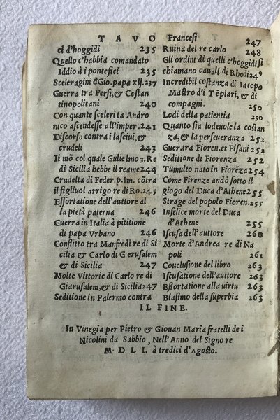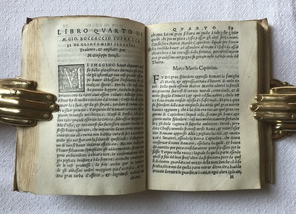 In-8. 264, (12) c., legatura coeva in tutta pergamena floscia, asole con resti di bindelle, titolo sbiadito anticamente manoscritto alla testa del dorso. Carattere corsivo, un poco di romano. Bella insegna dello stampatore al frontespizio, antica nota manoscritta al verso, sguardie disotto con corte annotazioni a matita. Alcuni capilettera ornati. Carte II4-8 con minuta galleria di tarlo al margine bianco. Testo pulito e fresco, margini corti come per i libri da viaggio. Frontespizio leggermente impolverato, minime gore ai margini delle prime tre carte. Un'ottima copia. Seconda edizione (la prima è del 1545) di questa traduzione italiana di "De casibus virorum illustrium", tradotta da Giuseppe Betussi da Bassano e dedicata al conte Collaltino di Collalto, uomo d'armi e letterato stimato, di cui il Betussi fu segretario. Riguardo all'opera, nel DBI Treccani, alla voce "BOCCACCIO, Giovanni", si legge quanto segue: "In nove libri l'autore vi raccoglie, con evidente intento morale, biografie di personaggi illustri, da Adamo ai suoi contemporanei, che, dopo esser stati singolarmente favoriti dalla fortuna, furono alla fine precipitati per la loro follia e il loro orgoglio in un abisso di miseria. L'impianto erudito-moralistico dell'opera ne giustifica la straordinaria fortuna negli ambienti umanistici e paraumanistici europei durante tutto il Rinascimento e fino alle soglie del XVIII secolo, fortuna attestata dalle numerose edizioni e dalle versioni italiane, francesi, inglesi, spagnole, tedesche. Le notizie storiche sono attinte a cronache e repertori medievali, da Paolo Diacono a Paolino Minorita, e trovano un preciso riscontro negli abbondanti materiali raccolti in alcune sezioni del cosiddetto Zibaldone autografo magliabechiano. Per il lettore moderno sono di maggiore interesse i capitoli dedicati a fatti e persone degli ultimi tempi, come la descrizione della persecuzione dei Templari, il ricordo di Carlo I d'Angiò, la tragica fine di Filippa di Catania favorita della regina Giovanna, il quadro dell'esecrata tirannide del duca d'Atene: sono pagine in cui sopravvive, e si fa strada faticosamente fra i pesanti paludamenti di una pur sincera eloquenza moralistica, almeno un'ombra dell'antico gusto narrativo e aneddotico." EDIT16 CNCE 6322. Codice inventario libreria A41