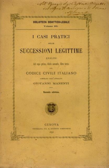 I casi pratici di successioni legittime. Analisi del capo primo, titolo secondo, libro terzo del codice civile italiano compilata dall'Avvocato Giovanni Manenti.