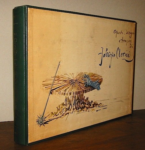 Album in folio (cm. 40,5x28,5), 289(3) pp. di cui circa 200 riproducono appunti, disegni e tempere di Fabrizio Clerici. Ritratti originali di Jean Cocteau (2) e Fabrizio Clerici (eseguiti da L. Civerchia). Legatura ed. in simil-pelle con un disegno in oro al piatto anteriore. Custodia fig. con lievi abrasioni, ma nel complesso ottimo esemplare. Edizione a tiratura limitata e numerata (ns. 333/600). Dedica di Fabrizio Clerici. Eccezionale insieme, caratterizzato fortemente dal grande ritratto di Clerici sulla prima carta. Il volume proviene dalla biblioteca del pittore romano Luigi Civerchia. I ritratti qui presenti mostrano l’idea di concepire il libro come un intelligente ed espressivo contenitore di memorie, le proprie innanzitutto, ma anche quelle dei diversi personaggi che egli ritrae, come intrecciandone i destini tra le pagine di uno stesso testo. Vale la pena notare che il nostro pittore ha scelto solo i libri come gallerie per i ritratti. Chi ha visitato qualche sua mostra, tra le tante tenutesi in Italia e all’estero, avrà infatti osservato che nei paesaggi o in altre composizioni le figure umane sono per lo più assenti, o comunque, hanno un ruolo del tutto secondario. E’ quindi una vera scoperta il Civerchia ritrattista, e lo è ancor più considerando la particolarità di esprimersi su di un mezzo singolare come sono le pagine di un libro. Luigi Civerchia è nato a Roma, nel popolare quartiere di Trastevere, nel 1928. Dopo una prima esperienza presso la bottega di uno scultore, continua il suo percorso nell’Atelier di Vittorio Grassi, momento fondante della sua formazione umana ed artistica. Si avvicina poi alla Scuola Romana seguendo con entusiasmo gli insegnamenti dei suoi Maestri ideali: Mafai, Pirandello e Quaglia.