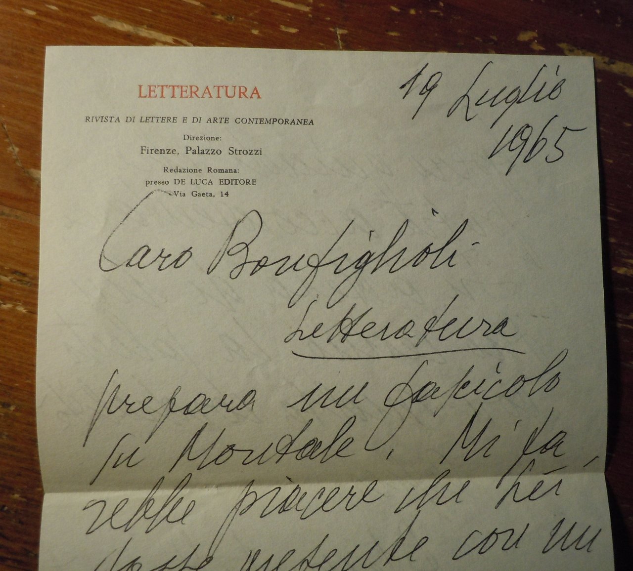 Sansoni, La Rosa dei Venti - N. 3. Collezione diretta da Alessandro Bonsanti. Prima edizione ottobre 1956. Br. ed. cucita, in 8°, pp. 323 + (5). Con velina di protezione. Intonso, fogli chiusi in testa. ALLEGATA una lettera (e busta) su carta intestata della rivista LETTERATURA indirizzata al professor Pietro Bonfiglioli; in data 19 luglio 1965, scritta su due lati, foglio di cm 14 x 22.