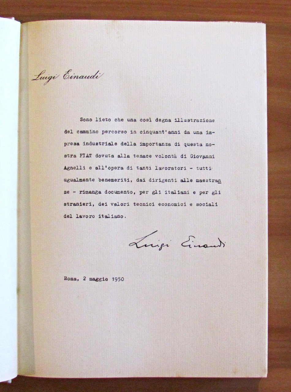 Illustrazioni e tavole in b/n n.t e f.t. di diversi artisti, tra cui Carrà e De Chirico. Mondadori - Milano, 1951. Cartonato editoriale con doppia sovraccoperta in cartone e acetato. Contiene biglietto originale dell'omaggio della Società Fiat. 19,5x27; pp.299+XII di foto in b/n ante-retro. COME NUOVO , Ottimo (Fine)