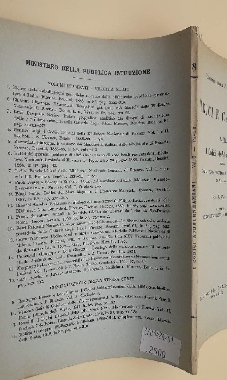In 8', br. ed. pp. da 401 a 480, privo di frontespizio; I Codici Ashburnhamiani della Biblioteca Medicea Laurenziana di Firenze, a cura di Enrico Rostagno e Teresa Lodi. Bruniture al dorso e ai margini, piccola mancanza all'angolo sinterno alla resta del dorso, interno in buono stato, intonso. ***Due to bureaucratic reasons, books dated over 70 years old cannot be immediately exported, please contact us before placing the order.***