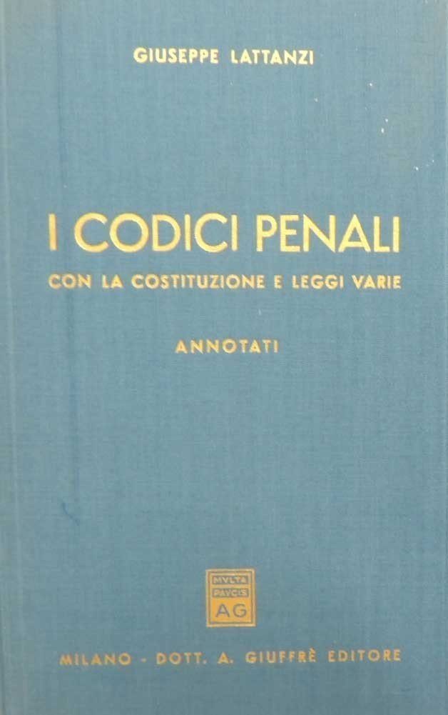 I codici penali con la Costituzione e leggi varie, annotati a cura di Giuseppe Lattanzi, Dott. A. Giuffrè Editore, Milano 1978, decima ed. aggiornata al 4 agosto 1978, pp. VIII, 2287, cm 20, legatura in tela ed. con titoli al dorso e al piatto e sovraccoperta in acetato. Piccole mancanze all’acetato di protezione, per il resto perfetto.