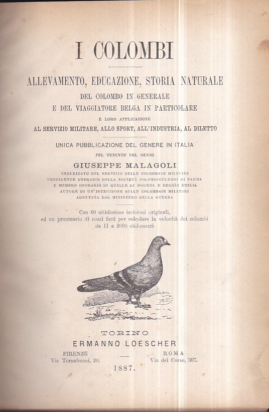 I colombi. Allevamento, educazione, storia naturale del colombo in generale e del viaggiatore belga in particolare e loro applicazione al servizio militare, allo sport, all' industria, al diletto. Unica pubblicazione del genere in Italia. Con 60 nitidissime incisioni originali , ed un prontuario di conti fatti per calcolare la velocità dei colombi da 11 a 2000 chilometri
