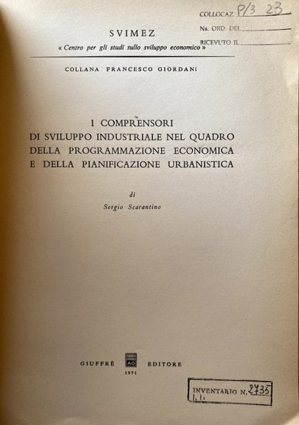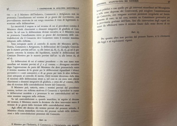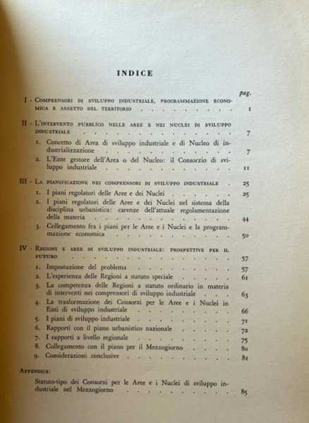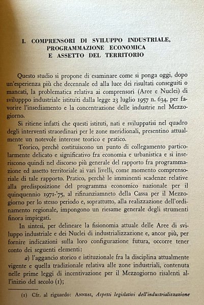 Soggetti: Politica economica, Industrializzazione, Italia meridionale, Piani territoriali di coordinamento, Comprensori di sviluppo industriale, Studi economici, Meridionalismo, Economia, Libri Vintage Fuori catalogo, Collezionismo, Urbanistica, Pianificazione, Architettura, Edilizia, Sviluppo economico, Cassa per il Mezzogiorno, Annesi, Legislazione, Industrie, Anni Sessanta, Anni Settanta, Dopoguerra, Consorzio, Area, Nucleo, Programmazione economica, Regioni, Statuto Speciale, Enti, Statuto-tipo, Analisi, Previsioni, Modelli, Disciplina urbanistica, Aree, Nuclei, Legge n. 634 23 Luglio 1957, Insediamento, Concentrazione, Interventi straordinari, I.N.U., Mancini, Calandra, Porti franchi, Zone industriali, Napoli, Risorgimento economico, La Malfa, Della Porta, Sylos Labini, Giovannelli, Ortolani, Piano regolatore, Espropriazione, Procedimento espropriativo, Pubblica utilità, Vincoli, Legge, Governo, Ministero dell'industria, del commercio e dell'artigianato, Articoli, CIPE, Taviani, Consiglio di Stato, Distretti industriali, Produzione, Delocalizzazione, Imprese, Abruzzo, Campania, Puglia, Murgia, Sicilia, Abruzzo, Provvedimenti, Aree depresse, Economic policy, Industrialization, Southern Italy, Territorial coordination plans, Industrial development areas, Economic studies, Economy, Out of print books, Collecting, Urban planning, Planning, Architecture, Construction, Economic development, Legislation, Industries, Sixties, Seventies, Postwar period, Consortium, Nucleus, Economic planning, Regions, Special Statute, Bodies, Statute-type, Analysis, Forecasts, Models, Urban planning, Areas, Settlement, Concentration, Extraordinary interventions, Ports Franks, Industrial areas, Naples, Regulatory plan, Expropriation, Expropriation procedure, Public utility, Constraints, Law, Government, Ministry of industry, commerce and crafts, Articles, Council of State, Bagnoli, Relocation, Companies, Measures, Depressed Areas