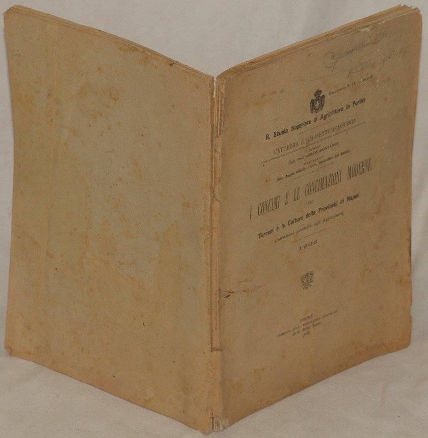 In 8. Dim. 26x18 cm. Pp. 143. Interessante pubblicazione del 1906 un manuale sui concimi e le coltivazioni moderne per i terreni e le coltivazioni della provincia di Napoli scritto da Moldo Montanari e edito dalla Scuola Suepriore di Agricoltura a Portici, Bollettino n. 11, Serie II. Nella prima parte nozioni elementari sulle piante, terreni e concimi, segue il prontuario delle concimazioni per i terreni e le coltivazioni della provincia di Napoli (piante erbacee, piante legnose). Alla fine appendice sui fertilizzanti. Per ogni pianta la relativa sostanza con dosi da utilizzare, metodologia e periodo. Alla fine tabella. In buone condizioni. Copertina editoriale originale Copertina editoriale in discrete condizioni generali con usure ai margini e dorso. Legatura in discrete condizioni con rotture. All'interno le pagine si presentano in buone condizioni con fioriture. Interesting pamphlet of 1906 a manual about modern cultivations and fertilizers of the province of Naples written by Moldo Montanari edited by Scuola Superiore di Agricoltura a Portici, Bollettino n. 11, Serie II. In the first part elementary notions about plants, soils and fertilizers, then the pronctuary about fertlizers for soils and cultivations of the province of Naples (grass, wood). At the end appendix about fertilizers. For each plante substance with quatity to be used, method and period. Chart at the end. In good conditions. Editorial original cover Editorial cover in fair general conditions with wearings in the edges and spine. Binding in fair conditions with cracks. Inside pages are in good conditions with foxings.