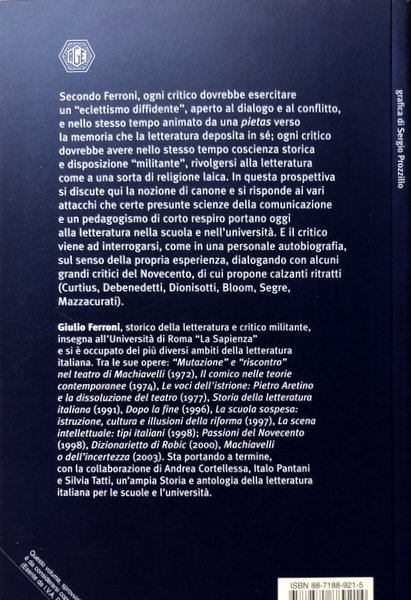 Secondo Ferroni, ogni critico dovrebbe esercitare un "eclettismo diffidente", aperto al dialogo e al conflitto, e nello stesso tempo animato da una pietas verso la memoria che la letteratura deposita in sé; ogni critico dovrebbe avere nello stesso tempo coscienza storica e disposizione "militante", rivolgersi alla letteratura come a una sorta di religione laica. In questa prospettiva si discute qui la nozione di canone e si risponde ai vari attacchi che certe presunte scienze della comunicazione e un pedagogismo di corto respiro portano oggi alla letteratura nella scuola e nell'università. E il critico viene ad interrogarsi, come in una personale autobiografia, sul senso della propria esperienza, dialogando con alcuni grandi critici del Novecento, di cui propone calzanti ritratti (Curtius, Debenedetti, Dionisotti, Bloom, Segre, Mazzacurati).