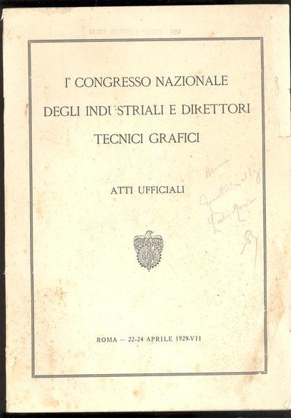 IN 4°, pp.72, COPERTINA EDITORIALE CON TITOLO ENTRO CORNICE. RITRATTI in b/n. a pp. di :<BR>MUSSOLINI, BOTTAI, POMBA + 2 FOTO f.t. ATTI UFFICIALI DEL PRIMO CONGRESSO NAZIONALE DEGLI INDUSTRIALI E DIRETTORI TECNICI - GRAFICI. TEMI DEL CONGRESSO : 1) TECNICO ARTISTICO. 2) ECONOMICO SINDACALE. ) SCUOLE PROFESSIONALI. 4) ORGANIZZAZIONE SCIENTIFICA - INCREMENTO DELLA PRODUZIONE E RIDUZIONE DEI RELATIVI COSTI. PRESIDENTE : GR. UFF. ING. GIUSEPPE LUIGI POMBA. ROMA, 22 - 24 APRILE 1929 - VII. VECCHIA DEDICA A MATITA ROSSA ALLA PRIMA DI COPERTINA,CON TRACCE DI POLVERE, MINIME SPELLATURE AL DORSO, PRIMA CARTA BIANCA CON PICCHIETTATURE, ALTRIMENTI OTTIMO STATO DI CONSERVAZIONE GENERALE. ID 3545