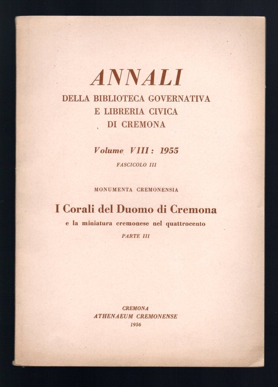 Opuscolo vintage. Estratto dagli Annali della Biblioteca Governativa e Libreria Civica di Cremona - Vol. VIII - Fasc. III. Illustrazioni in bn fuori dal testo. Usura da scaffale. Ordinario segno del testo.