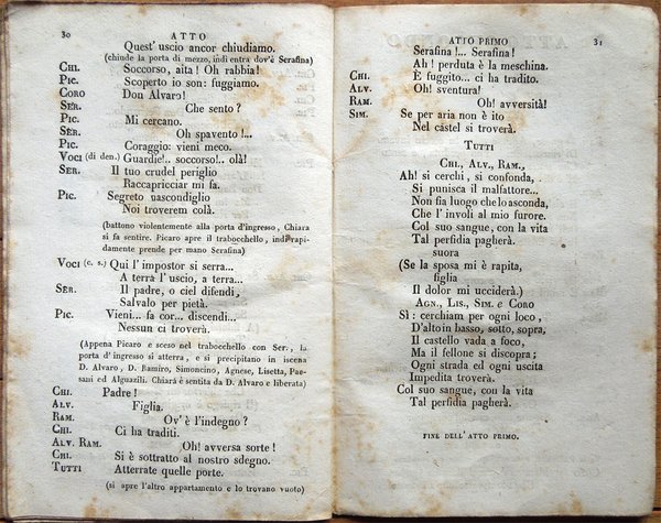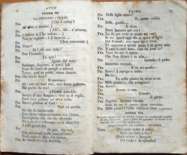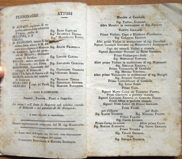 In-16° (16,6 x 10,6 cm), pp. 48, copertina editoriale con titoli entro cornice decorata. Qualche normale segno d'uso e del tempo alla copertina, in particolare, alla prima di copertina, firma d'appartenenza e data scritte da mano coeva; vignetta al frontespizio. Piccolo restauro nell'angolo inferiore del foglio con al recto il frontespizio, lontano dai titoli. A pagina 4, nome di uno degli attori corretto mediante piccola striscia di carta, riportante il nome corretto, a stampa, incollata su quello errato. Qualche segno d'umido alle pagine, lieve segno di piegatura longitudinale, per il resto ben conservato. Libretto della première dell'opera, andata in scena il 15 febbraio 1840. Personaggi e attori: D. Alvaro, capitano di vascello, reduce dalla schiavitù d'Algeri, padre di, Gaetano Rossi; Serafina, e di, Teresa Brambilla; Chiara, Rosina Mazzarelli [al posto di Elisabetta Beltrami Barozzi]; D. Fernando, tutore di Serafina, falso amico di D. Alvaro, ricco signore di Minorca, Francesco Regini; D. Ramiro, figlio del podestà di Minorca, destinato sposo di Serafina, Catone Lonato; Picaro, antico servitore di D. Fernando, ora Pirata, Celestino Salvatori; Simoncino, benestante del villaggio di Belmonte, Giuseppe Frezzolini; Lisetta, figlia di Sancio e di, Rosina Olivieri; Agnese, custode del castello di Belmonte, Teresa Ruggeri; Spalatro e Gennaro, capi de' Pirati, Antonio Benciolini e Napoleone Marconi; Cori e comparse: Paesani, Paesane, Pirati e Guardie. La scena è nell'Isola di Majorca nel vecchio castello di Belmonte e nel palazzo di D. Fernando. Musica del Maestro Mazzucato. Scenografia di Baldassare Cavallotti e Domenico Menozzi. Musicisti. Maestro al cembalo: Giacomo Panizza; Altro Maestro in sostituzione al sig. Panizza: Giovanni Bajetti; Primo Violino, Capo e Direttore d'Orchestra: Eugenio Cavallini; Altri primi Violini, in sostituzione al sig. Cavallini: Giovanni Cavinati e Alessandro Migliavacca; Capi dei secondi violini a vicenda: Giacomo Buccinelli e Giuseppe Rossi; Primo Violino per i Balli: Gaetano Montanari; Altro primo Violino, in sostituzione al sig. Montanari: Rinaldo Somaschi; Primo Violoncello al Cembalo: Vincenzo Merighi; Altro primo Violoncello in sostituzione al sig. Merighi: Gaetano Storioni; Primo Contrabbasso al Cembalo: Luigi Rossi; Prime Viole: Carlo Maino e Pietro Tassistro; Primi Clarinetti a perfetta vicenda: Ernesto Cavallini e Felice Corrado; Primi Oboe a perfetta vicenda: Carlo Yvon e Giovanni Daelli; Primi Flauti: per l'Opera, Giuseppe Raboni, pel Ballo, Filippo Marcora; Primo Fagotto: Antonio Cantù; Primo Corno da caccia: Evergete Martini; Altro primo Corno: Cipriano Gelmi; Prima Tromba: Giuseppe Viganò; Arpa: Giuseppe Reichlin. Direttore di Cori: Giulio Granatelli; Istruttore del Coro: Antonio Cattaneo; Editore della Musica: Giovanni Ricordi; Suggeritore: Giuseppe Grolli; Vestiarista proprietario: Pietro Rovaglia e Comp.; Direttore della sartoria: Giacomo Colombo; Capi sarti: da uomo, Antonio Felisi, da donna, Paolo Veronesi; Berrettonaro: Francesco Zamperoni e figlio; Fiorista e Piumista: Giuseppa Robba; Esecutori degli attrezzi: padre e figlio Rognini; Macchinista: Giuseppe Spinelli; Parrucchieri: Innocente Bonacina e Eugenio Venegoni; Appaltatore dell'illuminazione: Giovanni Carignani.