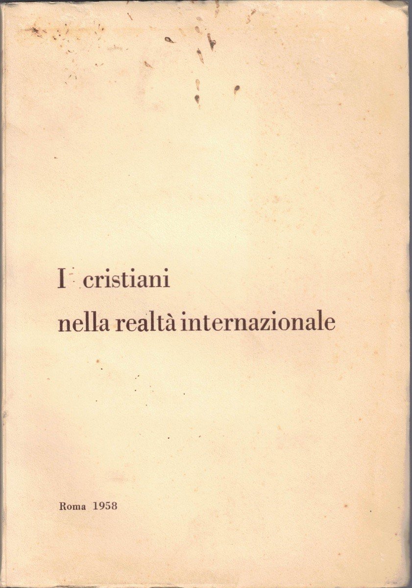 I cristiani nella realtà internazionale. XXV del Movimento Laureati di Azione Cattolica Italiana. XX Congresso Nazionale, a cura del Movimento Laureati di A. C., s.n., Roma 1958, pp. 293, cm 25, br. ed. Indice: Prefazione – La prolusione e le relazioni relazione generali (S. E. Mons. Antonio Puma, La Chiesa di fronte alla realtà internazionale – Mario Bendischioli, I precedenti storici della situazione attuale – Paolo Emilio Taviani, Aspetti e problemi della realtà internazionale) – I lavori delle commissioni (Commissione per l’aspetto economico-sociale – Commissione per l’aspetto culturale – Commissione per l’aspetto politico-giuridico – Commissione per l’aspetto religioso) – Seduta conclusiva (Saluto dell’Assistente Ecclesiastico Generale dell’A.C.I. – Sintesi dei lavori delle Commissioni – Conclusioni del Presidente Centrale – Conclusioni dell’Assistente Ecclesiastico Centrale) – Appendice: Vittorino Veronese, Realtà attuale e religione – Nota bibliografica – Indice degli interventi. Lievi tracce d’uso, qualche macchiolina alla prima di copertina, leggere di fioriture, minima brunitura della carta, per il resto ben conservato.