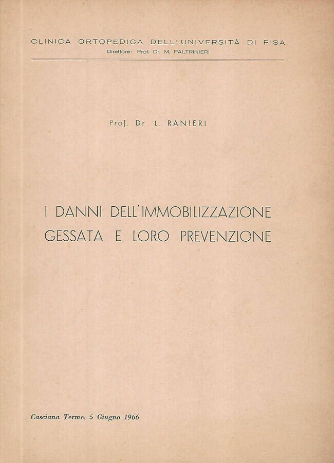 Pubblicazione della Clinica Ortopedica dell'Università di Pisa diretta dal prof. Dr.M. Paltrinieri. Brossura in cartoncino, ben conservata, con macchia di inchiostro nero al piatto posteriore. Pagine ingiallite in buono stato. Numero pagine 48.