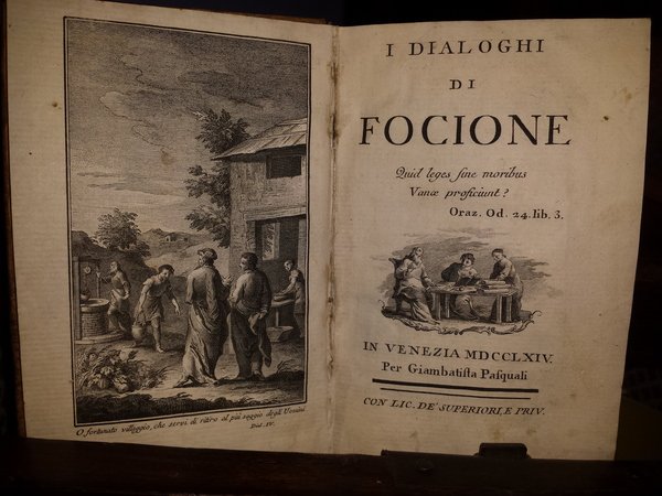 In-8 (15,5 cm) (1) c. (antiporta) (2) XXVII (1) 243 (1). Marca editoriale al frontespizio. Antiporta inciso con vignetta e scritta"O fortunato villaggio che servi di ritiro al più saggio degli Uomini. Dial. IV". Testatine, finalini ed iniziali xilografati. Legatura ottocentesca in cartone rivestito di carta marmorizzata, con tassello e caratteri dorati al dorso. Mably Bonnot Gabriel (1709-1785) Avviato alla carriera ecclesiastica, l'abbandonò per dedicarsi alla vita politica e allo studio delle leggi. Membro dell'Accademia di Lione. Nato a Grenoble e morto a Parigi. Bell'esemplare anche se rifilato.