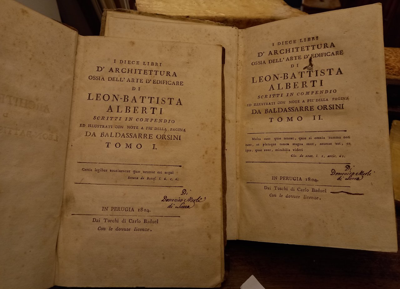 In-8 (21,5 cm) 2 voll VIII 175 (1) I c. (di tav.); (4) 208 II-VIIIc. (di tav.). Occhietto con titolo prima dei frontespizi. Mezza pelle, piatti cartonati rivestiti di carta marmorizzata. I dieci libri d'architettura ossia dell'arte d'edificare di Leon-Battista Alberti scritti in compendio ed illustrati con note a pie della pagina da Baldassarre Orsini. Firma di appartenenza al frontespizio. Foro da tarlo alle prime pagine del secondo tomo (da piatto alla pagina 9) con perdita di qualche lettera.In-8 (21.5 cm) 2 vols VIII 175 (1) I c. (of table); (4) 208 II-VIIIc. (from plate). One-eye with title before the title pages. Half leather, cardboard plates covered with marbled paper. The ten books of architecture or the art of building by Leon-Battista Alberti written in compendium and illustrated with footnotes by Baldassarre Orsini. Signature of belonging to the title page. Woodworm hole on the first pages of the second tome (from plate to page 9) with loss of a few letters.