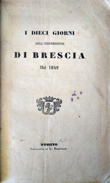 Tipografia G. Marzorati, Torino, luglio 1849. Prima edizione originale. In 8vo, pp. 113 + 1 cartina lit. e rip. in fine della città con una legenda toponomastica. L'ultima sezione è dedicata al “Nome e cognome di morti che si sono potuto ricavare”, quindi all'elenco, con nome, età e professione, di coloro che persero la vita nelle giornate dell'insurrezione. Opera anonima ma scritta per mano di Cesare Correnti, il quale redasse un sentito resoconto dei dieci giorni, dal 23 marzo al primo aprile 1849, giorni in cui la città, ribattezzata per il suo strenuo coraggio "La Leonessa d'Italia", oppose resistenza all'invasione austriaca. Vecchia bross. in carta. Manca la bross. originale, uniforme ingiallimento e normali segni del tempo alle pagine, un leggero arricciamento dei tagli, discreta conservazione.