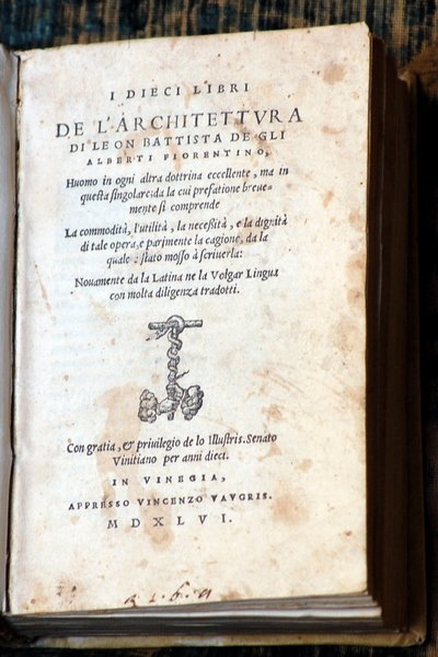 [Architettura-Prima edizione] (cm.16,5) ottima piena pergamena sec. XVIII. Titolo calligrafato al dorso.-- cc. 12 nn., (di cui l' ultima bianca), cc. 248, c. 1 con la marca tipografica. La dedica del traduttore Pietro Lauro Modenese Ë a Bonifacio Bevilacqua. prima edizione in qualsiasi lingua moderna e prima traduzione italiana di questo capolavoro dell' architettura rinascimentale. L' Editio Princeps del " De Re Aedificatoria " apparve nel 1485 a Firenze e ripropone in dieci libri la struttura del testo di Vitruvio. I primi tre libri riguardano il progetto e l' esecuzione; nel 4∞ e 5∞ si esaminano le grandi opere come citt‡, ponti ecc. Nell' 8∞ e 9∞ si gtratta dell' apparato ornamentale, nel 10∞ si tratta di restauro e idraulica. Opera fondamentale non solo per l' architettura ma anche per il pensiero rinascimentale nel suo insieme. Qualche lieve traccia di polvere alla prima e ultima carta, altrimenti esemplare molto bello, nitido e con buoni margini, impresso in elegante corsivo con capolettera figurati. * Fowler 5; * Cicognara 373; * Schlosser 121-127; * Adams A 487; * Bm. Stc. 15.[f55]