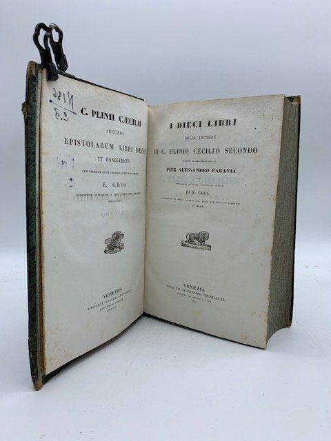 In 8 (cm 16 x 25,5), colonne 2362. Gora al margine inferiore degli ultimi 4 fogli circa. Legatura coeva in mezza pelle. Testo latino e traduzione italiana (due colonne per ciascuna pagina). Fa parte della collana "Biblioteca degli scrittori latini con testo a fronte" edita a Venezia, da Antonelli. Comprende I dieci libri delle lettere di Plinio il Giovane, seguiti da note, inoltre: "Panegirici antichi volgarizzati da Lorenzo Patarol"; "Ringraziamento di Eumenio per nome della citta' di Flavia a Costantino Augusto"; "Ringraziamento di Claudio Mamertino per lo consolato a Giuliano Augusto".
