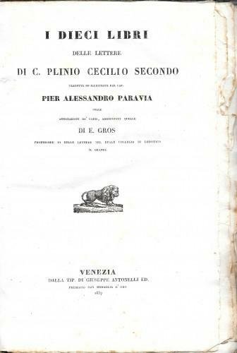 I dieci Libri delle Lettere. tradotte ed illustrate dal cav. Pier Alessandro Paravia. aggiuntevi quelle di E. Gros - PANEGIRICI ANTICHI volgarizzati da Lorenzo Patarol con nuove note - ORAZIONI PANEGIRICHE di Santo Ambrogio e del b. Magno Felice Ennodio