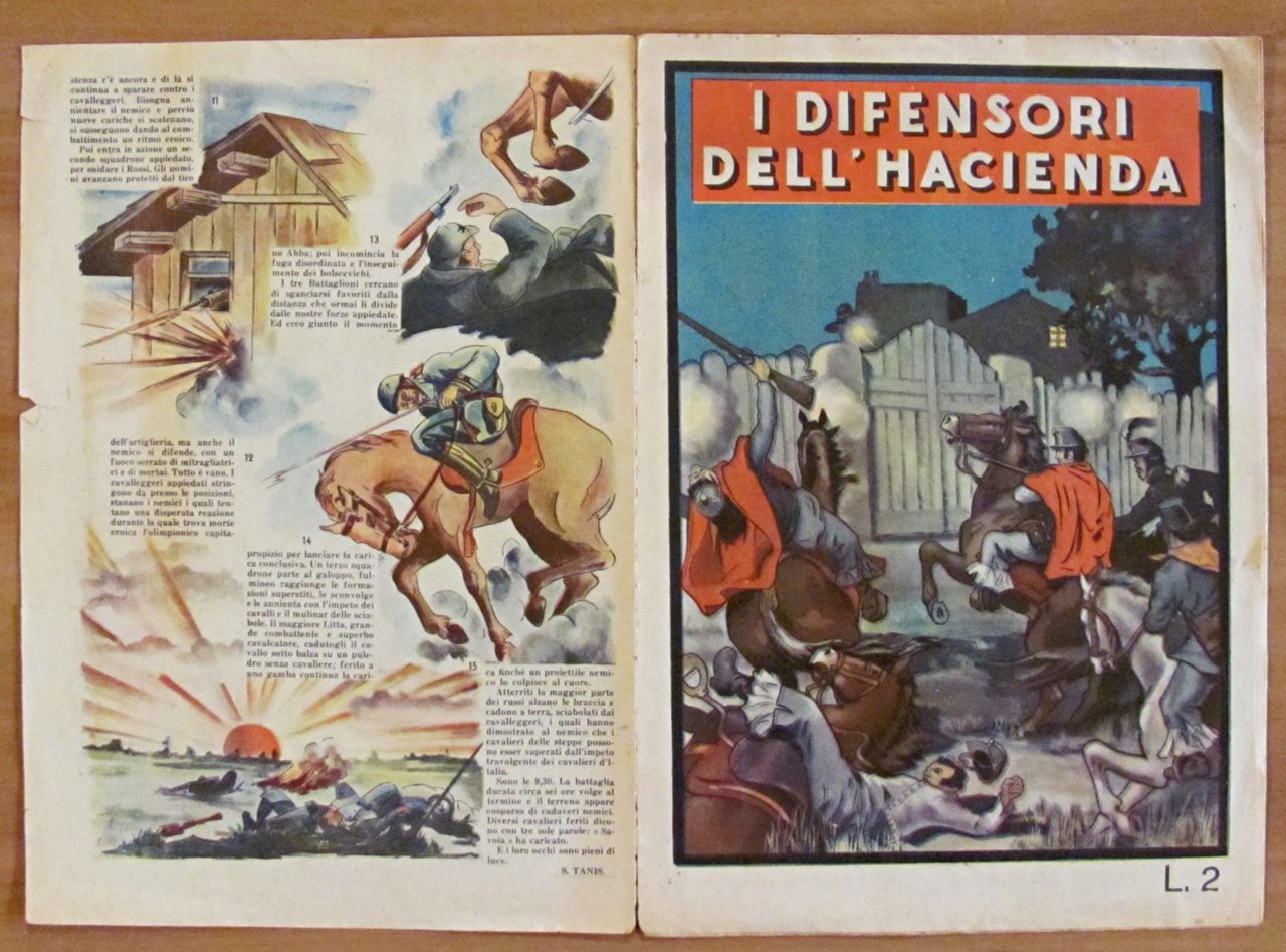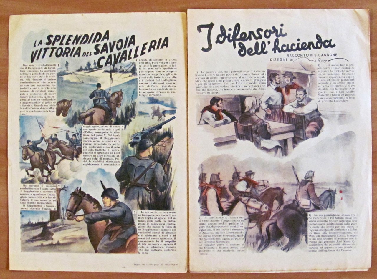 La splendida vittoria del Savoia Cavalleria. Illustrazioni a colori n.t. di Nico Rosso. Ed. Taurinia - 1935 (?). Brossura editoriale con apertura al margine superiore del dorso e piccolissimi taglietti al margine esterno delle sole copertine. Peraltro Ottimo. 18x25; pp.12 non numerate. Albo originale in Buonissimo stato. , Molto buono (Very Good)