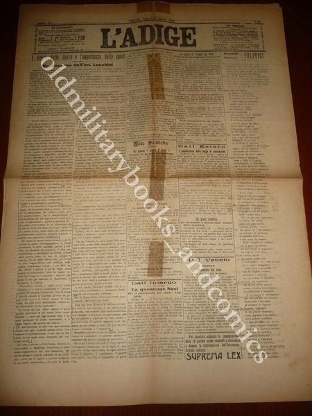 DESCRIZIONE: Giornale L'ADIGE 29/10/1908 composto da 4 pagine Numero con il discorso pronunxiato dall'Onorevole Luigi LUCCHINI su i diritti della donna e l'importanza dello sport. CONDIZIONI: Buone, pezzi di scocth. PESO / WEIGHT: 19 grammi without package