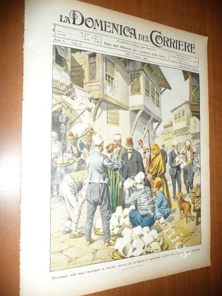 DESCRIZIONE: Domenica del Corriere, Milano, Anno X n. 51 (20-27 Dicembre 1908). COPERTINA: "Boicottaggio delle merci austriache in Turchia: mercato dei fez bianchi in opposizione a quelli rossi, di provenienza austriaca" (ill. di A. Beltrame). RETRO: "La mancanza di lavoro nelle Puglie: i forni presi d'assalto dai disoccupati a Cerignola" (ill. di A. Beltrame). La Domenica del Corriere è stato un popolare settimanale italiano fondato a Milano nel 1899 e chiuso nel 1989. Apparve per la prima volta nelle edicole l'8 gennaio 1899 come supplemento illustrato del Corriere della Sera. Stampata in grande formato (sul modello del domenicale La Tribuna illustrata), aveva 12 pagine e veniva distribuita gratis agli abbonati del Corriere, oppure si poteva acquistare in edicola per 10 centesimi. La prima e ultima di copertina erano sempre disegnate. Il Corriere si avvaleva di un giovane disegnatore, Achille Beltrame, allora sconosciuto, a cui veniva affidato in ogni numero il compito di rendere con la sua tavola il fatto più interessante della settimana. Dopo la sua morte nel 1945, fu sostituito da Walter Molino che, come il suo predecessore, firmò memorabili copertine. A differenza dei settimanali dell'epoca, la Domenica del Corriere diede ampio spazio alle fotografie e ai disegni, e questo fu uno dei motivi del suo successo. CONDIZIONI: Buone. Non spillato, prov. da rilegatura. PESO / WEIGHT: 100 gr. without package