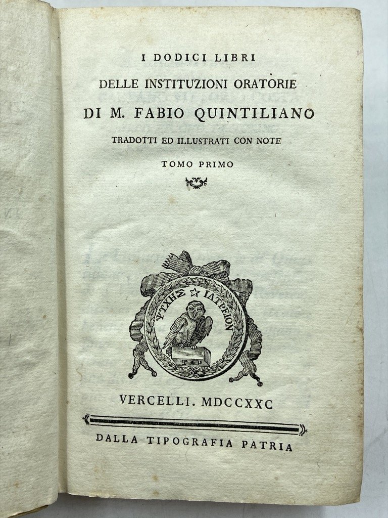 I DODICI LIBRI DELLE INSTITUZIONI ORATORIE DI M. FABIO QUINTILIANO TRADOTTI ED ILLUSTRATI CON NOTE. TOMO PRIMO (-QUARTO). VERCELLI. MDCCXXC. DALLA TIPOGRAFIA PATRIA. [1780]