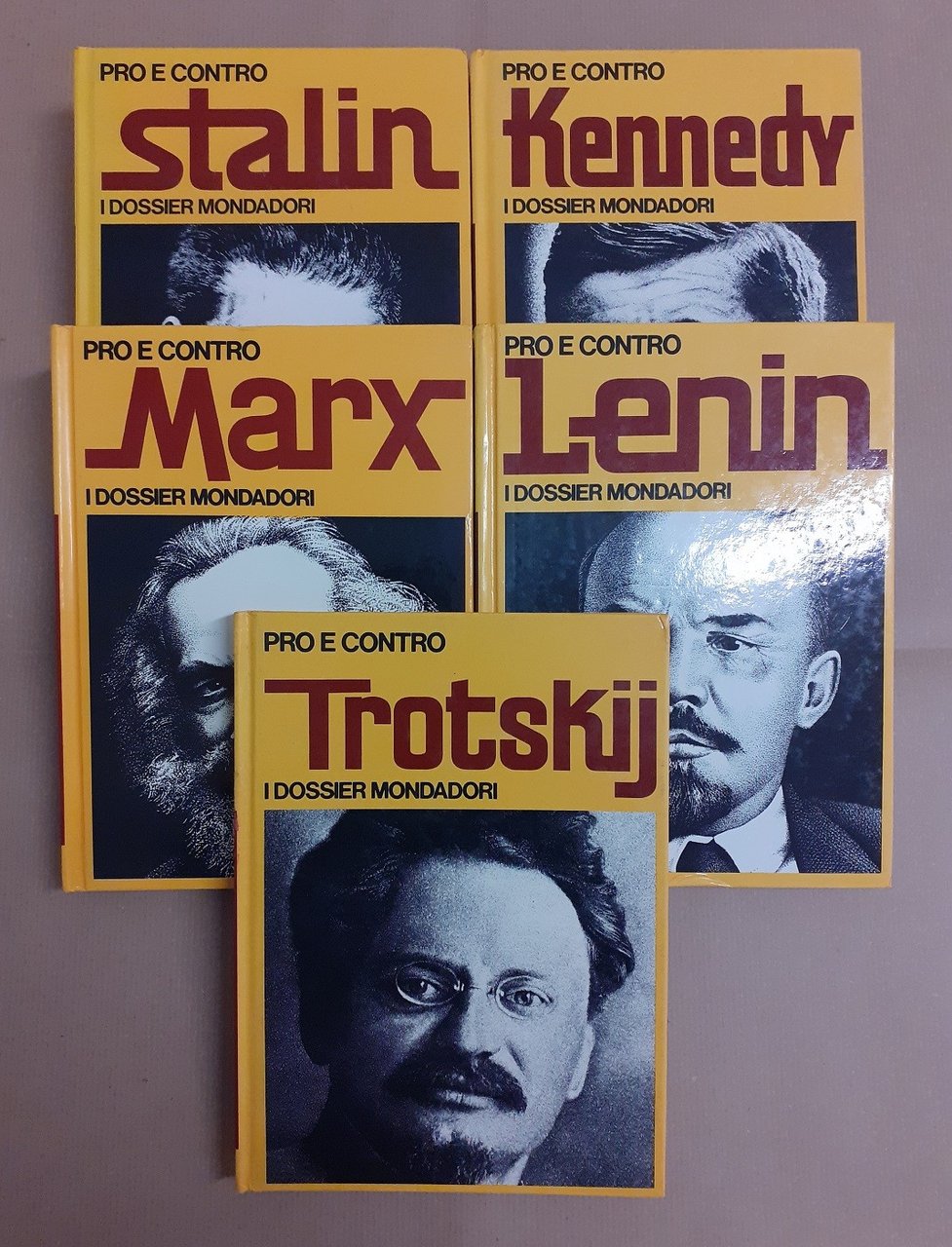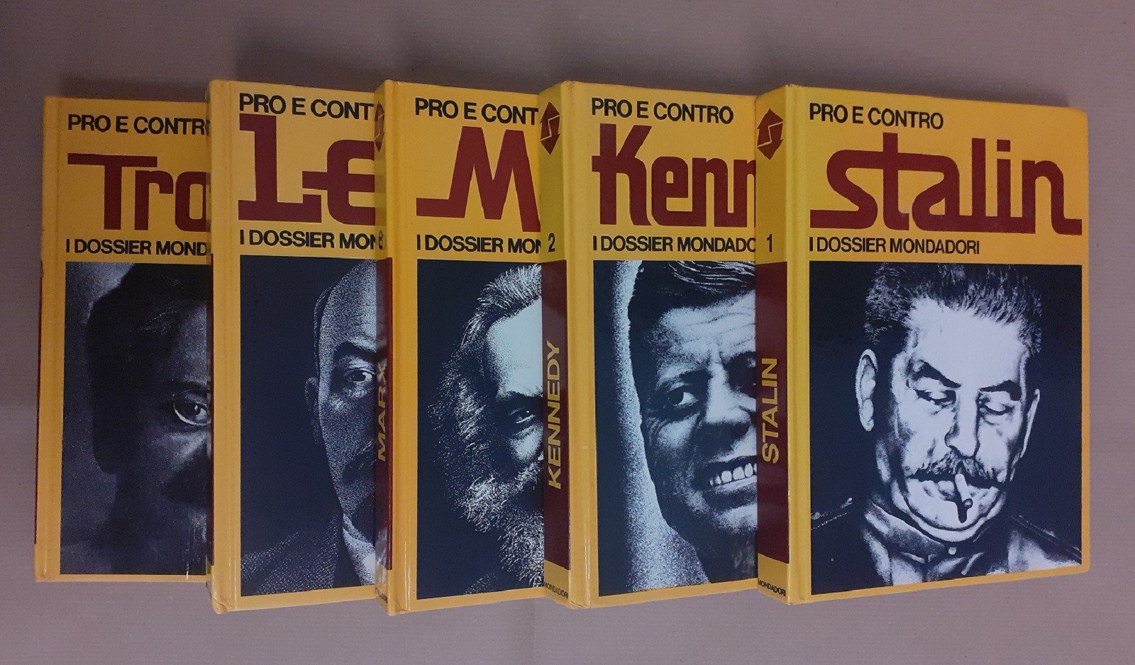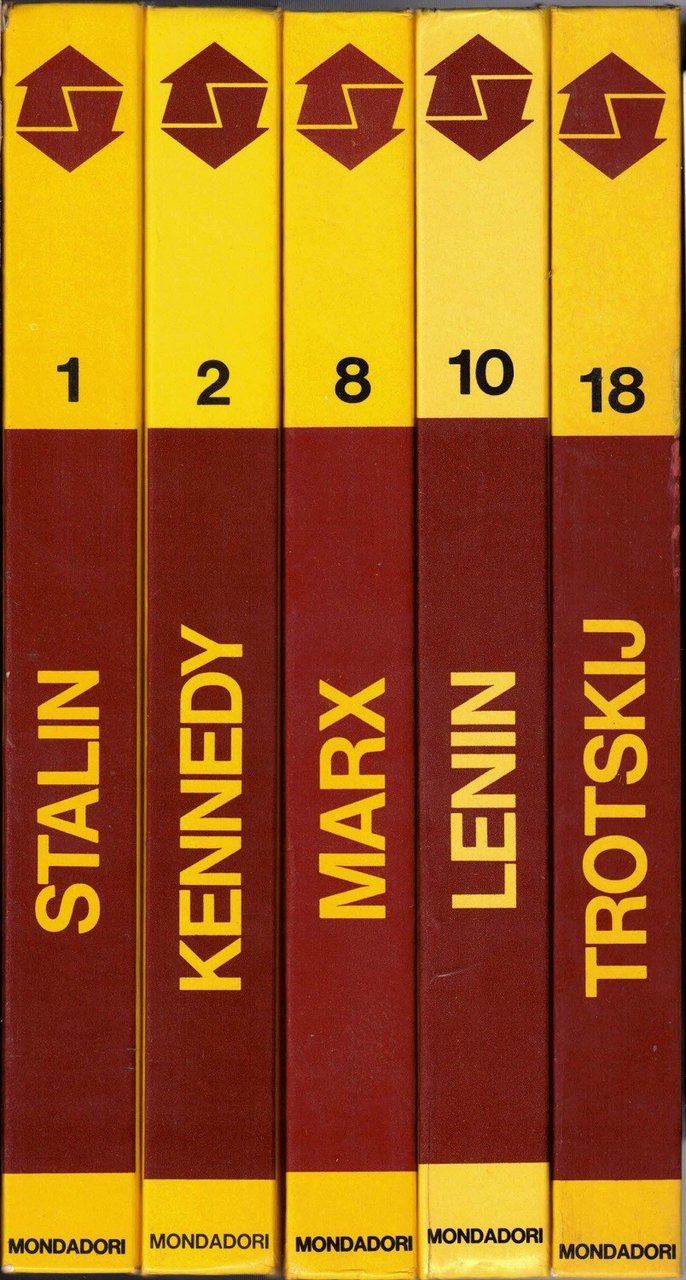Il lotto comprende 5 volumi della collana I dossier Mondadori, serie Pro e contro (voll. 1, 2, 8, 10, 18), Arnoldo Mondadori Editore, s.l. (ma stampato a Verona, presso le Officine Grafiche Veronesi della Arnoldo Mondadori Editore) 1971-1973, pp. 795 totali, ill. b.n., cm 22, cart. ed. con titoli al dorso e titoli e ill. b.n. ai piatti. Collana I dossier Mondadori, serie pro e contro, voll. 1,2,8,10,18. Dettaglio lotto: Stalin, a cura di Marisa Paltrinieri, Arnoldo Mondadori Editore, s.l. (ma stampato a Verona, presso le Officine Grafiche Veronesi della Arnoldo Mondadori Editore) 1971, pp. 159, ill. b.n., cm 22, cart. ed. con titoli al dorso e titoli e ill. b.n. ai piatti (collana I dossier Mondadori, vol. 1. Titolo alla prima di copertina: Pro e contro Stalin) – Kennedy, a cura di Marisa Paltrinieri, Arnoldo Mondadori Editore, s.l. (ma stampato a Verona, presso le Officine Grafiche Veronesi della Arnoldo Mondadori Editore) 1971, pp. 159, ill. b.n., cm 22, cart. ed. con titoli al dorso e titoli e ill. b.n. ai piatti (collana I dossier Mondadori, vol. 2. Titolo alla prima di copertina: Pro e contro Kennedy) – Marx, a cura di Marisa Paltrinieri, Arnoldo Mondadori Editore, s.l. (ma stampato a Verona, presso le Officine Grafiche Veronesi della Arnoldo Mondadori Editore) 1972, pp. 159, ill. b.n., cm 22, cart. ed. con titoli al dorso e titoli e ill. b.n. ai piatti (collana I dossier Mondadori, vol. 8. Titolo alla prima di copertina: Pro e contro Marx) – Lenin, a cura di Marisa Paltrinieri, Arnoldo Mondadori Editore, s.l. (ma stampato a Verona, presso le Officine Grafiche Veronesi della Arnoldo Mondadori Editore) 1972, pp. 159, ill. b.n., cm 22, cart. ed. con titoli al dorso e titoli e ill. b.n. ai piatti (collana I dossier Mondadori, vol. 10. Titolo alla prima di copertina: Pro e contro Lenin) – Trotskij, a cura di Marisa Paltrinieri, Arnoldo Mondadori Editore, s.l. (ma stampato a Verona, presso le Officine Grafiche Veronesi della Arnoldo Mondadori Editore) 1973, pp. 159, ill. b.n., cm 22, cart. ed. con titoli al dorso e titoli e ill. b.n. ai piatti (collana I dossier Mondadori, vol. 18. Titolo alla prima di copertina: Pro e contro Trotskij). Lievi tracce d’uso alle legature, minime fioriture ai primi due volumi (Stalin e Kennedy), leggera brunitura della carta, per il resto esemplari ben conservati. Ottimo insieme.